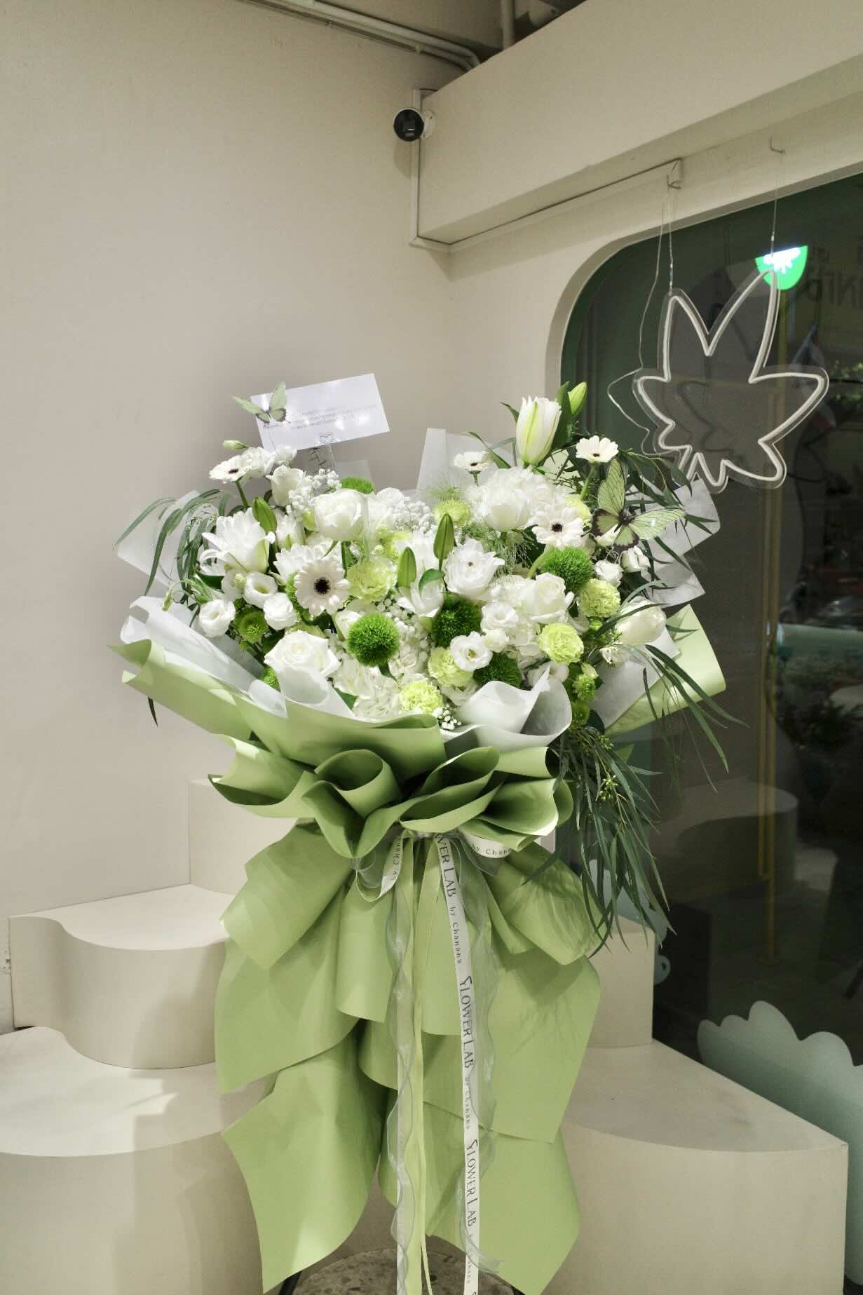 สแตนด์ดอกไม้ แสดงความยินดี โทนสีเขียว-ขาว – D10 ใช้สำหรับแสงความยินดี เปิดร้านใหม่ หรือมอบให้กับศิลปินที่คุณชื่นชอบ