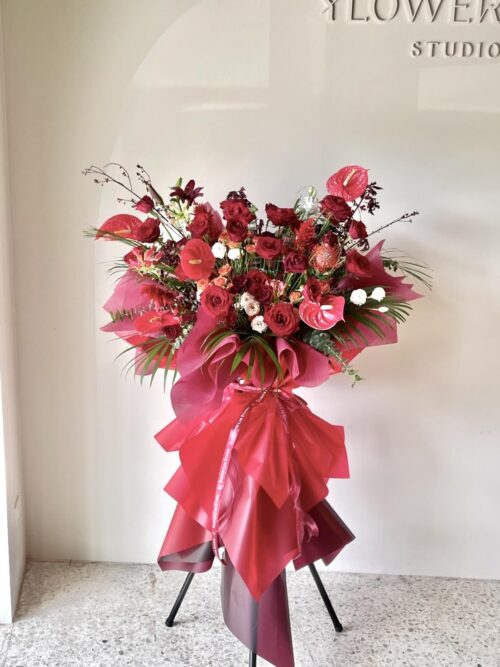 สแตนด์ดอกไม้ แสดงความยินดี โทนสีเเดง – D7 ใช้สำหรับแสงความยินดี เปิดร้านใหม่ หรือมอบให้กับศิลปินที่คุณชื่นชอบ