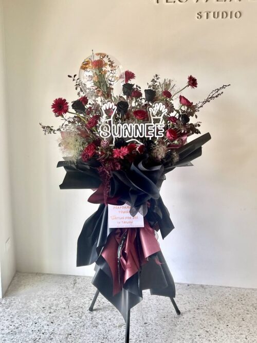 สแตนด์ดอกไม้ แสดงความยินดี โทนสีเเดง-ดำ – D15 ใช้สำหรับแสงความยินดี เปิดร้านใหม่ หรือมอบให้กับศิลปินที่คุณชื่นชอบ