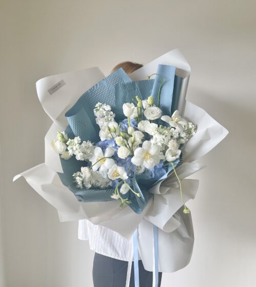 ช่อดอกไม้คละชนิดโทนสีฟ้าขาว blue white bouquet – B73 ดอกไม้คละชนิด กุหลาบ ทิวลิป ไฮเดรนเยีย จัดช่อโทนสีฟ้าและสีขาวขนาดใหญ่ไซด์ L