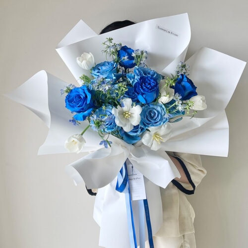 ช่อดอกไม้แสดงความยินดี ดอกกุหลาบสีน้ำเงินและสีฟ้า จากร้านดอกไม้ Flowerlab by Chanana ร้านดอกไม้ย่านเจริญนคร จัดส่ง Delivery ทั่วกรุงเทพฯ