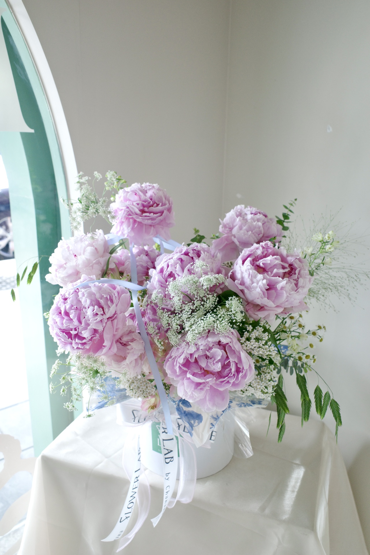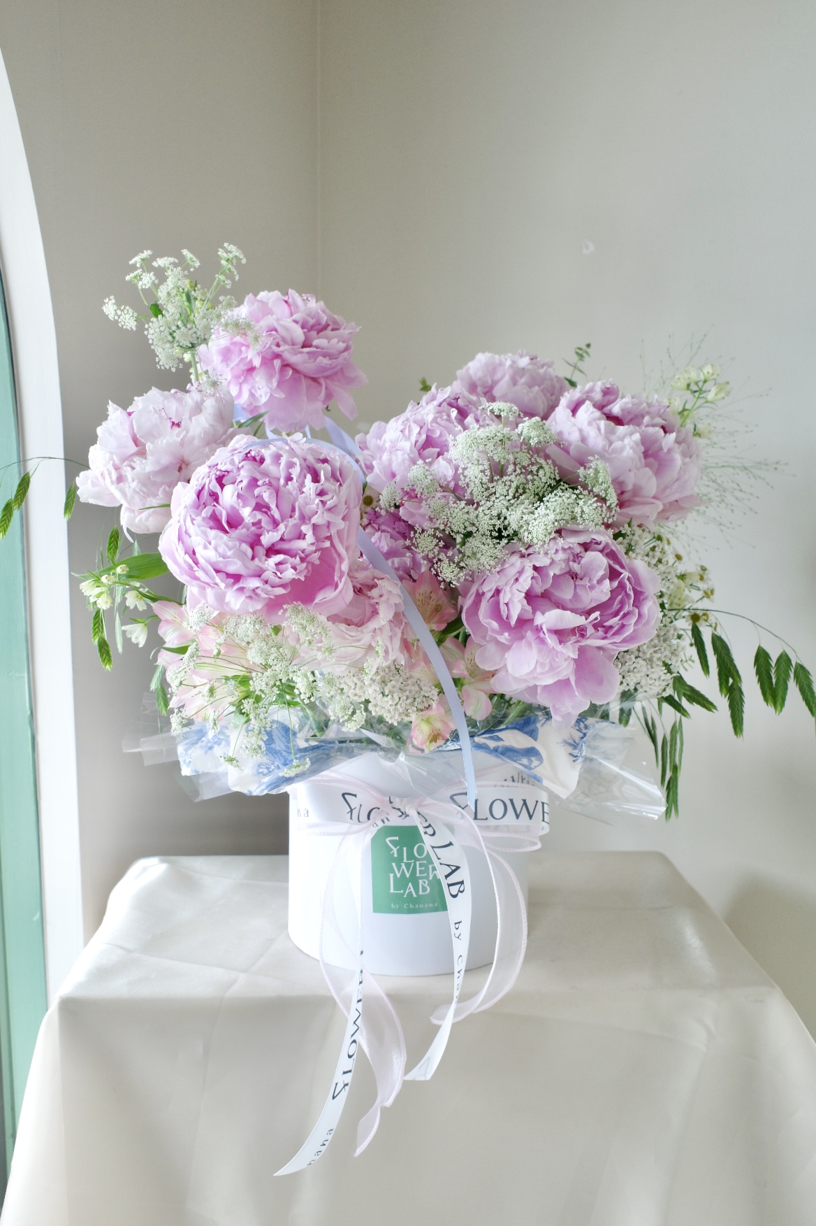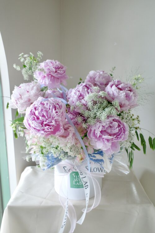 กล่องดอกพีโอนีสีชมพู- X33 จำนวน 10 ดอก พร้อมดอกอื่นๆ โทนสีขาวเพิ่มความละมุนในสไตล์เกาหลี จากร้านดอกไม้ Flowerlab by Chanana ร้านดอกไม้ย่านเจริญนคร จัดส่ง Delivery ทั่วกรุงเทพฯ